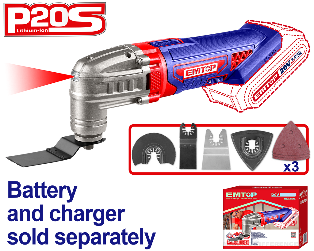 Multiherramienta Emtop inalámbrica 20V, versátil y práctica para cortar, lijar y más. ¡Y lo encuentras en La nueva eléctrica!
